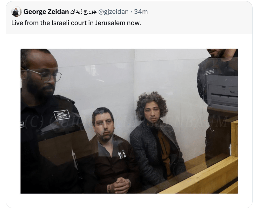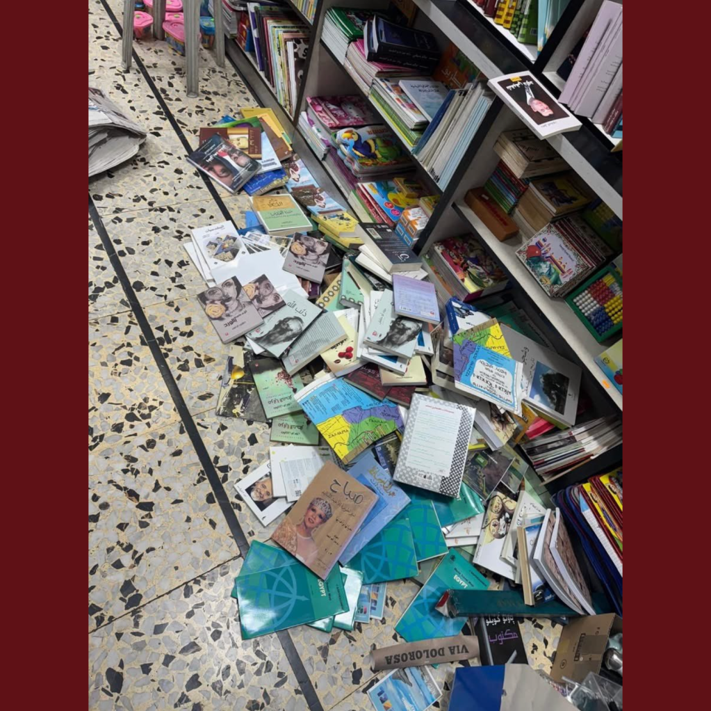 “Mahmoud and Ahmad were accosted by undercover Israeli police in the bookshop around 3pm on 9 February 2025. They were arrested and led away in handcuffs to prison. Dozens of books have been confiscated. ‘They used Google Translate on the books, and anything they didn’t like, they took,’ said Murad Muna, Mahmoud’s brother. ‘They even found a Haaretz newspaper with a picture of the hostages and asked what it was, saying it was incitement. They took every book with a Palestinian flag on it.’