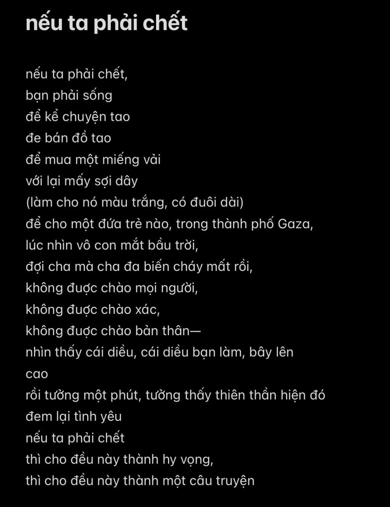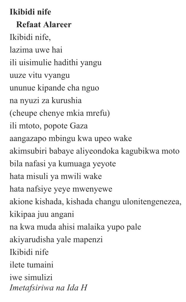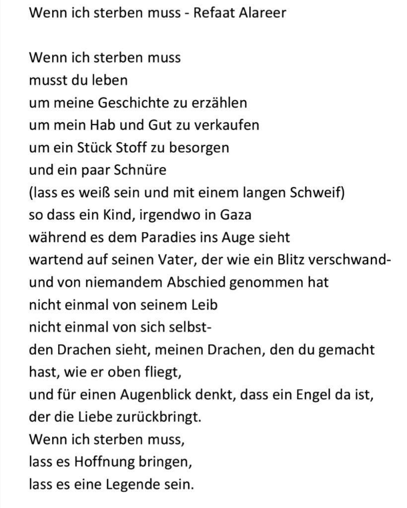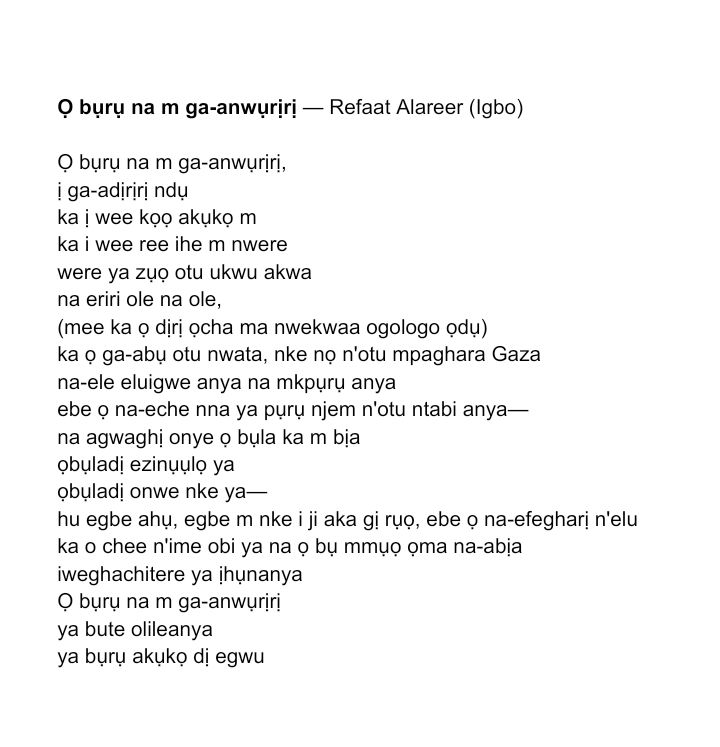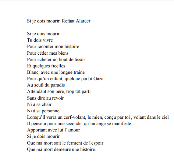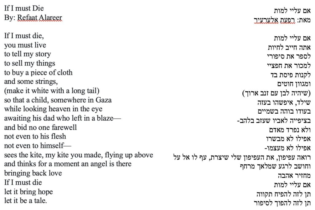 On January 15, 2024, forty days after Palestinian poet, editor, and educator Refaat Alareer was killed under Israeli bombardment, we are calling for a Global Day of Action, followed by a week of events, in which we read his poetry in public and refuse business as usual, demanding an end to the genocide and the occupation. One thing you can do to participate is to read his poetry in public. Here, “If I Must Die,” in 39 languages.