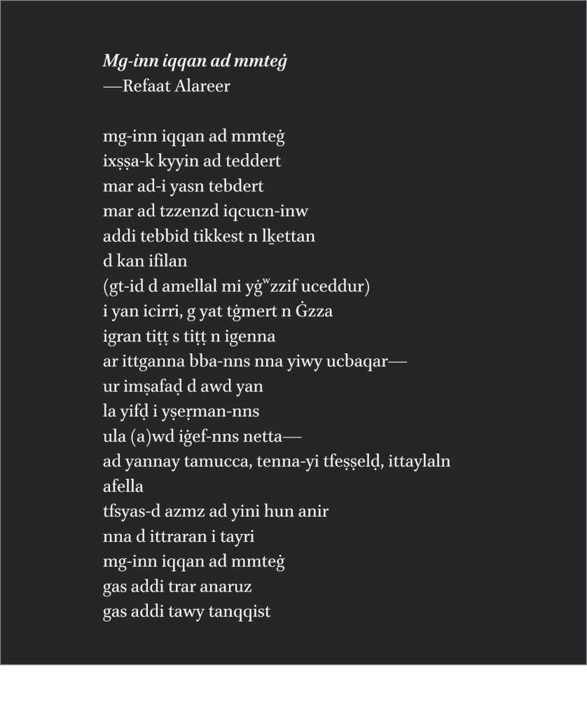Find more translations collected by Refaat’s publisher, Just World Books, and at IfIMustDie.