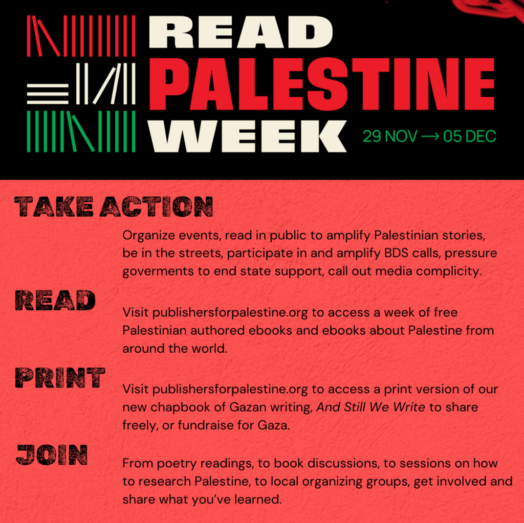 Organize your own actions for READ PALESTINE WEEK, November 29 – December 5. Let us know about them so we can share and amplify.